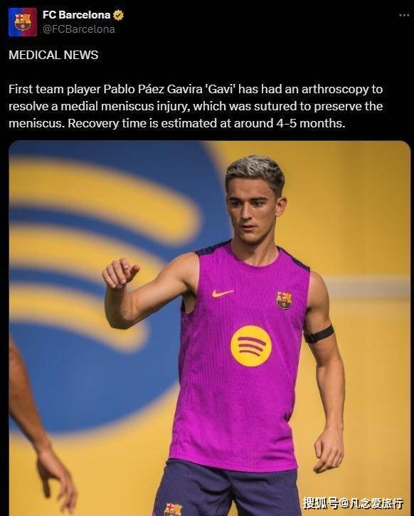 但经过详细的检查和评估,最新消息显示,加维还是接受了手术治疗。巴萨在推特上发布了消息,一队球员加维已接受关节镜手术,目的是解决内侧半月板撕裂问题,而且手术采用的是缝合方式来保留半月板。预计康复时间为4至5个月,按照这个时间推算,加维要到2026年初才能复出。